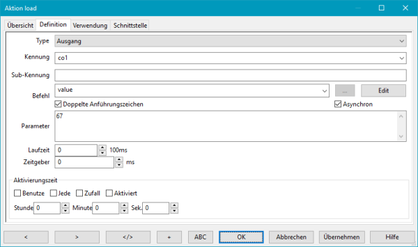 Eine Ausgangs-Aktion mit dem Befehl "value" (Wert) einstellen.