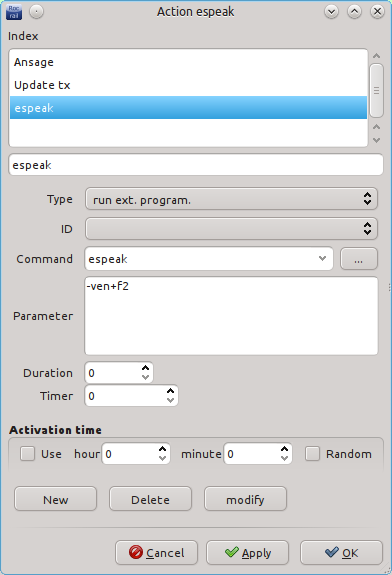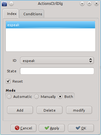 | Example for an action to speak the updated text could look like this. | In the 'properties' of the text-element this action needs to be linked to this text object using the actioncontrol dialog like this. |