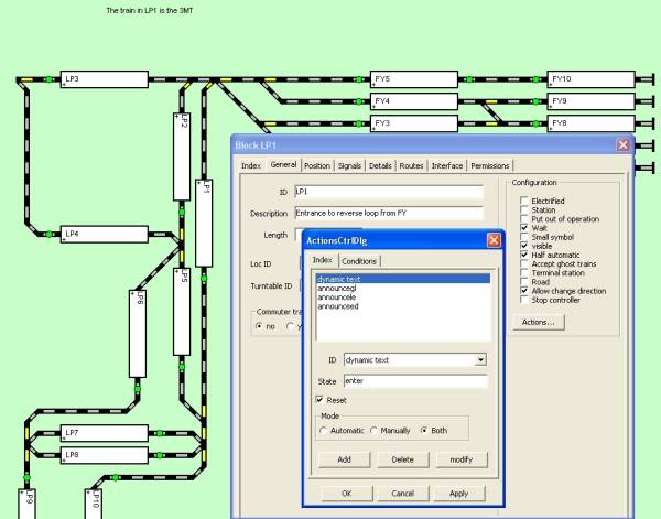 Following the example the Properties of block LP1 are chosen. In the Actions submenu the action that changes the dynamic text is chosen from the list in the ID field. The State field should read enter so that the action is initiated when a train enters the block.
