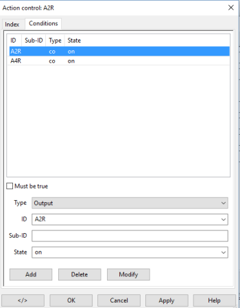 "Action Control: A2R" (Tables→Outputs→General(A2R)→Actions(FS 02-04)→Condition)