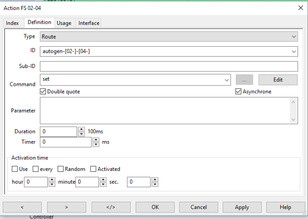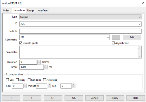 Thus, the output works as a "switch" with a timer. It allows time for the second button of the route to be used, all outputs are configured as a switch and have an output-related action “RESETxxx”, which sets the currently active output, back to inactive after 4 seconds. xxx is the name of the corresponding output.