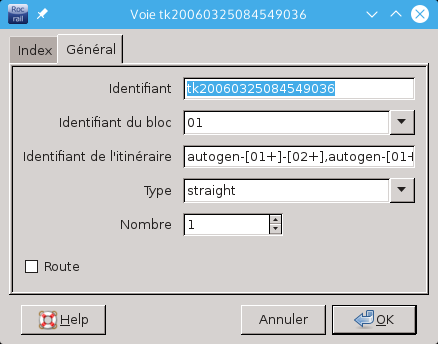 | Identifiant | Un unique identifiant, qui est utilisé par Rocrail pour adresser l'élément. Cette identifiant est habituellement assigné par Rocrail. | Vous devriez être très prudent, si vous modifié la valeur originale. |