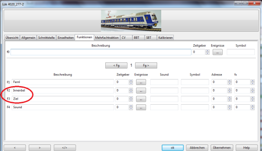Hier ein Beispiel ohne Verschieben der Funktionen (die Wagenfunktionen F2 Innenbeleuchtung und F3 Zielschild waren in der Lok zufällig frei):