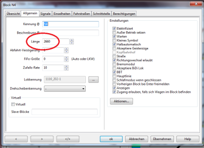- To make sure that a train fits into a block, the sum of the parameters minimum train length in block + length of the loco + sum of all lengths of all cars has to be less or equal to the block length.