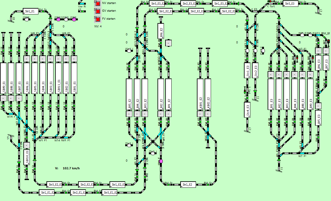 Die Blöcke SBf3_E1, SBf4_E1, SBf5_E1 bilden einen Schattenbahnhof für Fernverkehrs(FV)züge (Ortschaft, Mindestbelegung = 3, FiFo = ein), die Blöcke SBf1_E1, SBf2_E1, SBf6_E1, SBf11_E1 bilden einen Schattenbahnhof für Güter(GV)züge (Ortschaft, Mindestbelegung = 4, FiFo = aus).