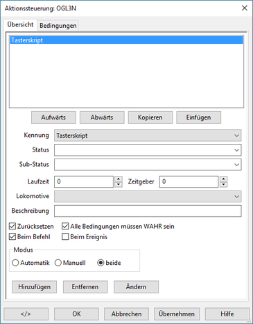 <if state="co OAW1N = on|co OGL1N = on"> <then> <st id="autogen-[AW1+]-[GL1-]" cmd="go"/> <!-- Stellen der Fahrstaße --> <co id="OAW1N" cmd="off"/> <co id="OGL1N" cmd="off"/> </then> </if>