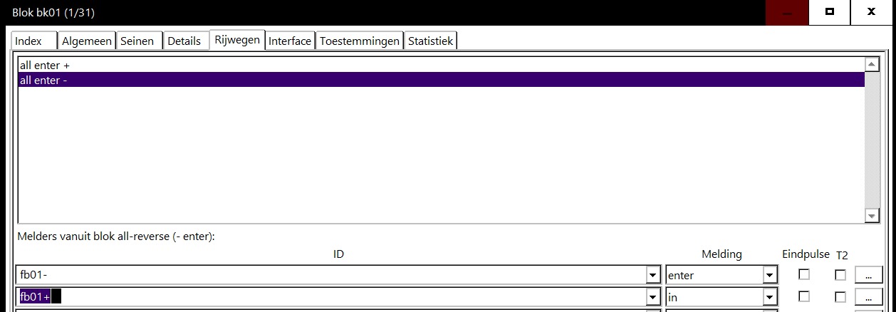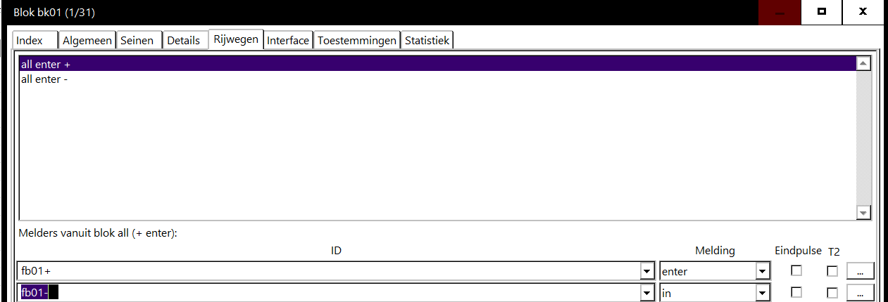 - Een blok moet twee melders hebben (er zijn uitzonderingen) voor de gebeurtenissen ENTER (trein komt een blok binnen) en IN (trein is compleet in het blok aangekomen).