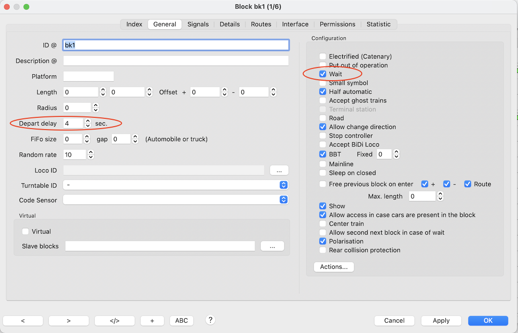 De waarde "Vertrekvertraging" (in seconden) maakt deel uit van de eigenschappen van een blok. Als de locomotief het "start" -commando krijgt, wordt het snelheidscommando vertraagd met de "Vertrekvertraging"
