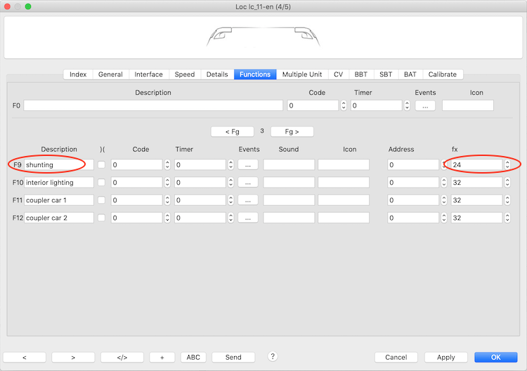 - the mapping fx = 24 is then entered in the properties of our locomotive for function # = 9.