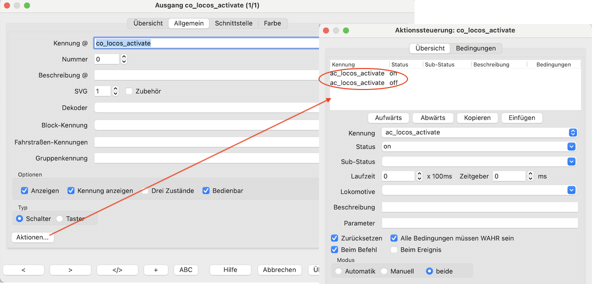 Ein Rocrail-Ausgang ruft das XML-Script auf im Status "on" und im Status "off":