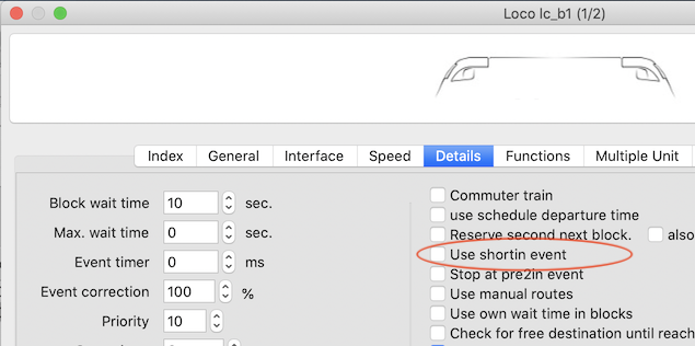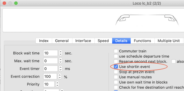 - Locomotive / Properties / Details / "Use shortin event" = NO (default)