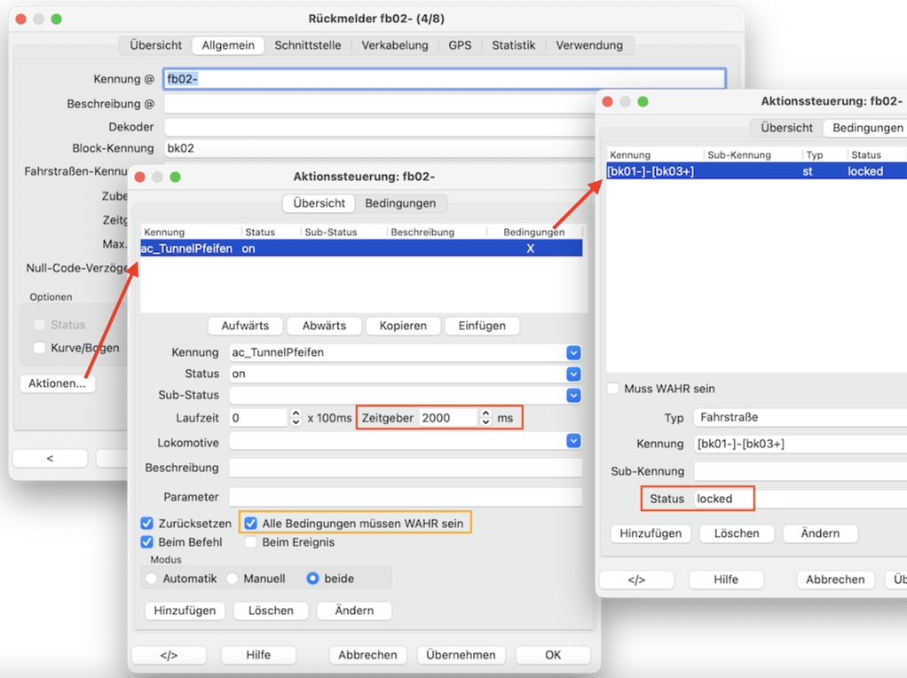 Die Aktion "ac_TunnelPfeifen" wird ausgelöst, wenn der Rückmelder "fb02-" aktiviert wird (Status gleich "on").