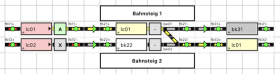 Damit man dennoch beide Blöcke bk31 oder bk32 erreichen kann, werden Fahrstrassen mit kreuzenden Blöcken angelegt:
