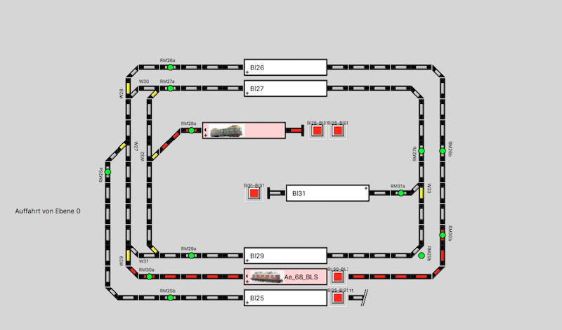 Dazu zunächst der überschaubare Bereich der Ebene 1 (Gebirgsgelände), wo ein Triebzugwagen (Blokkendoos) vom Bl28 nach 2 Runden in den Bl31 einfährt, um nach weiteren 2 Runden wieder zum Bl28 zurück zu kehren. In diesem Fall handelt es sich um einen Pendelzug (mit anderen Einstellungen in den Lok-Eigenschaften)