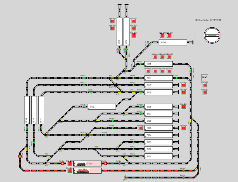 Die Gravita 10 im Block 24 (unterer Tunnel) beginnt ihre Tour mit der Betätigung des Schalter neben dem Bl24, fährt gem. Fahrplan 2 Runden und kehrt in den Bl24 (Heimatblock) zurück. Mit Erreichen dieses Ausgangsblocks (occupied) und der Wartezeit von 1 Minute startet die E-164 ihre Tour automatisch vom Block 12 aus, fährt gem. ihres Fahrplans ebenfalls 2 Runden, um sodann auch wieder in ihren Heimatblock einzukehren.