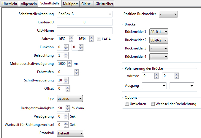 Hint: Due to design of the transfer taible the connectors of the bridge and tracks can let start the loco, before the bridge has stoped. Enter a value higher than 0 at „Delay“ within Interface options of the transfer taible. 1 second should be enough.