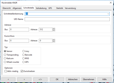 Rückmelderadressen beginnen bei Lenz über den RS-Bus immer mit 512, d.h. der erste Rückmelder am 1. Rückmeldemodul hat die Adresse 512, wobei das erste Rückmeldemodul die Adresse 65 hat. Die Adressierung des/der Rückmeldemodule(s) ist für Rocrail ohne Bedeutung, Rocrail verarbeitet nur die von der Rückmeldemodul-Adresse abhängige Adresse der Rückmeldekontakte / Belegmelder. Auch hier funktioniert bei mir nur die Eingabe der jeweiligen Adresse im Feld Port bei 0-Eintrag im Adressfeld.