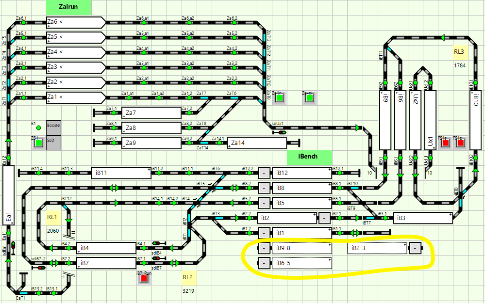 - iB6-5: Fügt iB6 und iB5 zu einem längeren virtuellen Block zusammen. Hier ist die Situation anspruchsvoller, es führt eine Kreuzung durch den virtuellen Block. Wenn iB6-5 belegt ist, muss verhindert werden dass eine FS über diese Kreuzung und durch den virtuellen Block gelegt wird. Dazu wird der Weichen-Befehl Setstatic / Resetstatic genutzt.