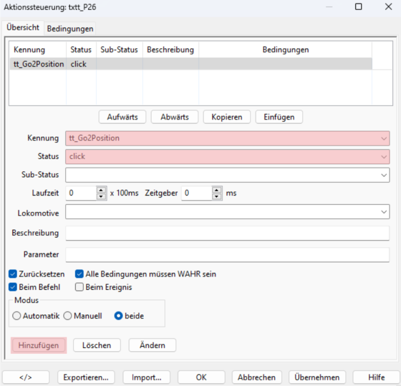 - Als Befehl den Namen des xml-Scripts eintragen. Auch dafür eine aussagekräftige Bezeichnung wählen (z.B. tt_Go2Position.xml)