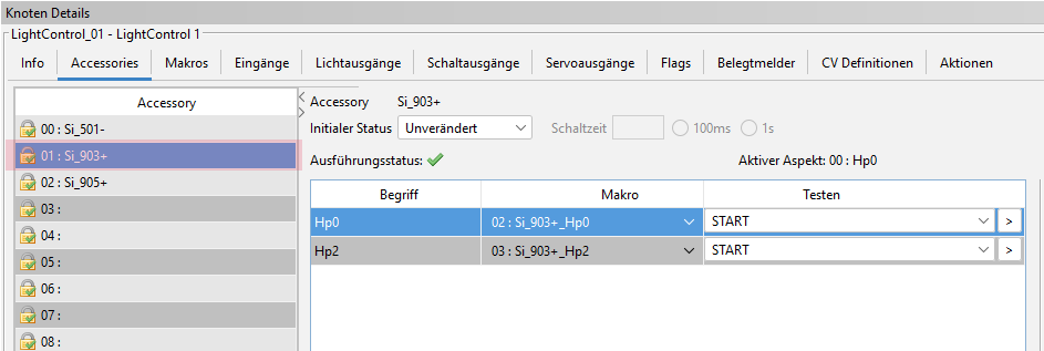 Es wird nun ein Accessory Si_903+ angelegt. Als Begriff 0 wird das Makro für die Signalstellung Hp0 definiert und als Begriff 1 jenes für die Signalstellung Hp2.