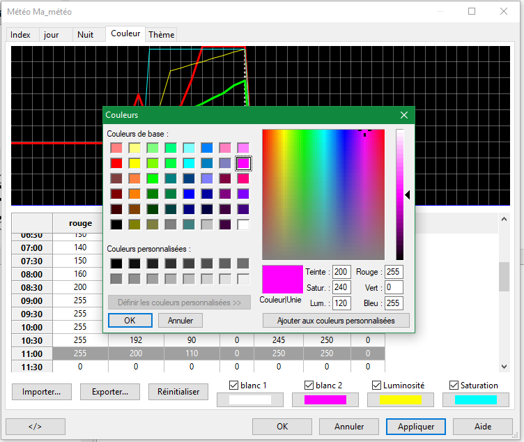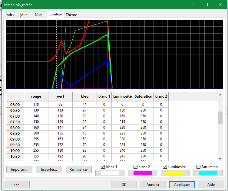 Le tableau des couleurs fournit une valeur RGBWWbs pour chaque demi-heure de la journée..