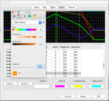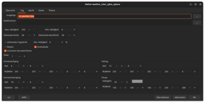 Die RGBWW-Werte für Sonnenauf- u. untergang sind zum/vom Mittag berechnet.