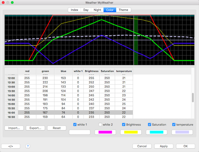 The color table provides a RGBWWbsC value for every half hour of the day.