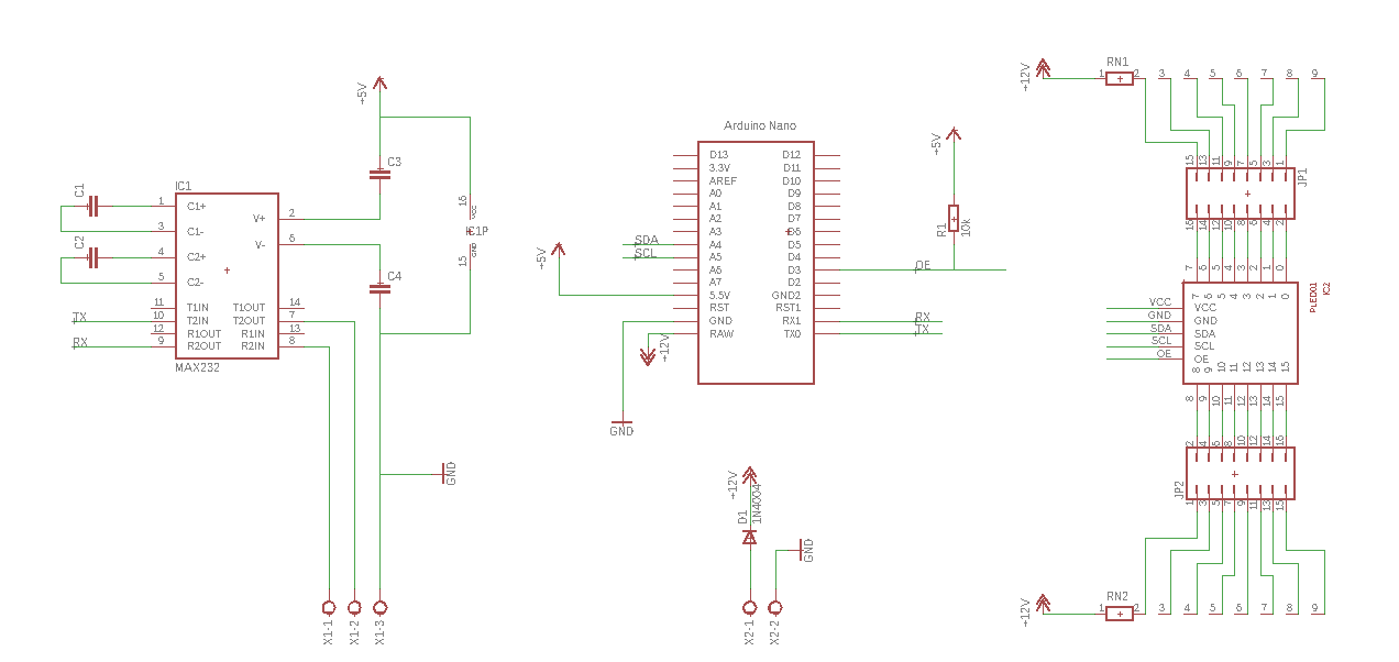 Die Hardware besteht aus einem MAX232 Pegelkonverter, einem Arduino NANO und einem PLED01 Baustein. Der PLED01 kann bei Display 3000 bezogen werden
