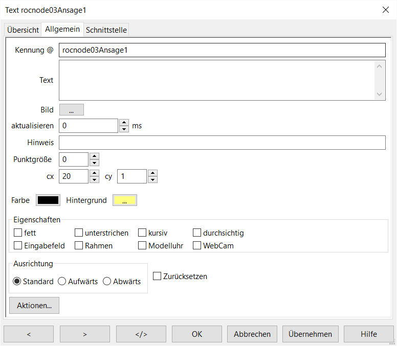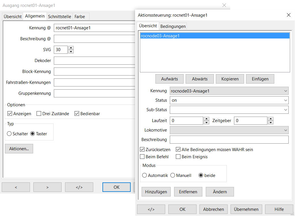 Die erstellte Aktion kann nun an einen Block angehängt werden und so die Einfahrt des Zuges in den Bahnhof ankündigen. Sie kann aber, auch zum Testen, an einen Ausgang gehängt werden. Wir erstellen dazu einen Ausgang und konfigurieren ihn wie erfolgt
