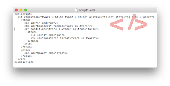 <xmlscript> <if condition="#var1 < &time" state="sg sem3 = green" class="bk 4711 = AB" alltrue="true" connect="and"> <then> <lc id="@loco" cmd="go"/> <tx id="booster1" format="var1 is #var1"/> </then> <else> <lc id="@loco" cmd="stop"/> <lc id="@loco" cmd="classset" class="AB"/> <bk id="4711" cmd="classdel" class="AB"/> <bk id="4711" cmd="classadd" class="CD"/> </else> </if> </xmlscript>