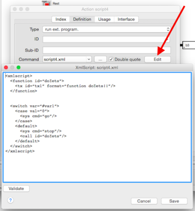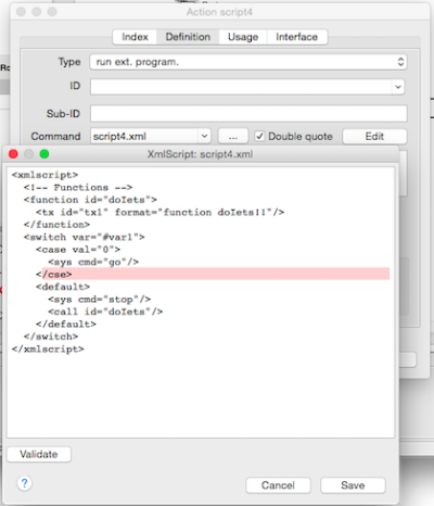 <xmlscript> <switch var="%callerid%"> <case val="loco1"> <sys cmd="go"/> </case> <case val="but1"> <sys cmd="reset"/> </case> </switch> </xmlscript>